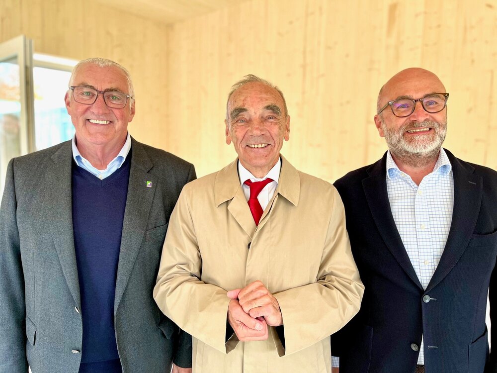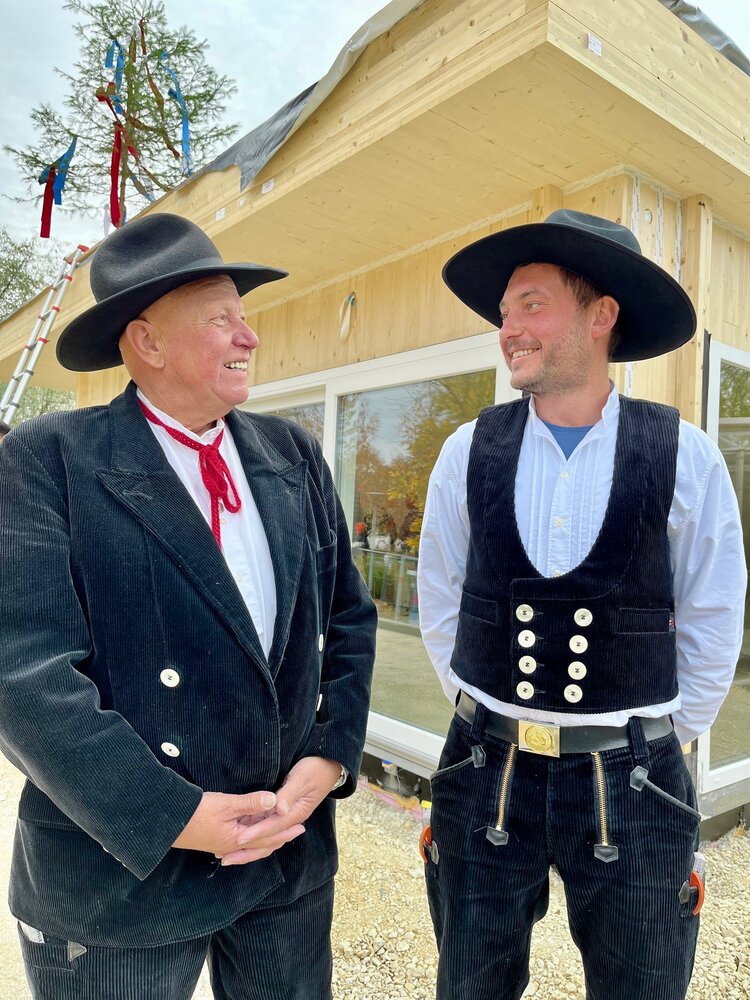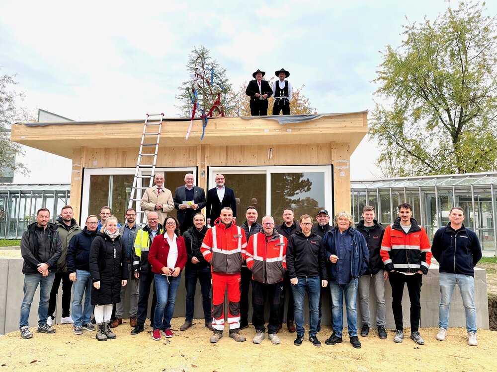 Vom Dach aus rief Erhard Uhl (Holzbau Uhl) den gut zweit Dutzend Anwesenden den Richtspruch zu. Selbstverständlich ging das auswendig. „Das habe ich im Laufe der Jahre schon mehrere hundert Mal gemacht. Da sitzt sowas“, meinte er. Der Hebauf hat für Uhl nichts an Glanz verloren. Er wird gefeiert, wenn der Rohbau steht und der Dachstuhl fertiggestellt ist. Das gilt auch für den von den Ausmaßen her (acht auf fünf Meter) überschaubaren Mitarbeiter-Pavillon. Und so dankte Munk an der Baustelle vor allem den Handwerkern für ihren Einsatz. „Sie sind die wahren Hauptakteure dieses Tages.“ Er fuhr fort: „Dass wir heute schon so weit sind, ist ein sichtbarer Beweis dafür, was möglich ist, wenn viele an einem Strang ziehen.“